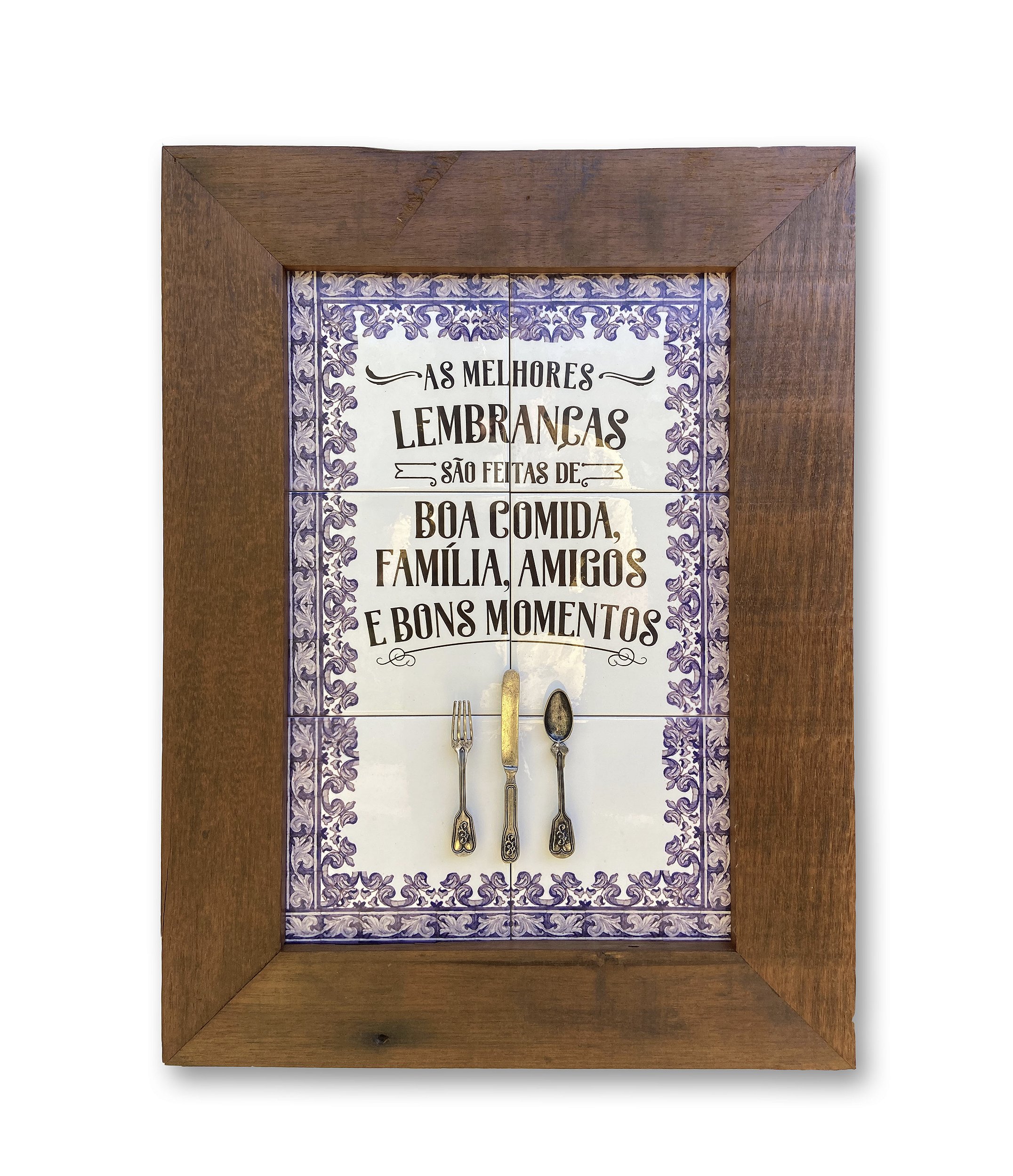 Quadro em madeira de demolição com miolo em 6 AZULEJOS no tamanho de 15x15cm, apliques de metais em fundição no tamanho de 62cm x 47 cm