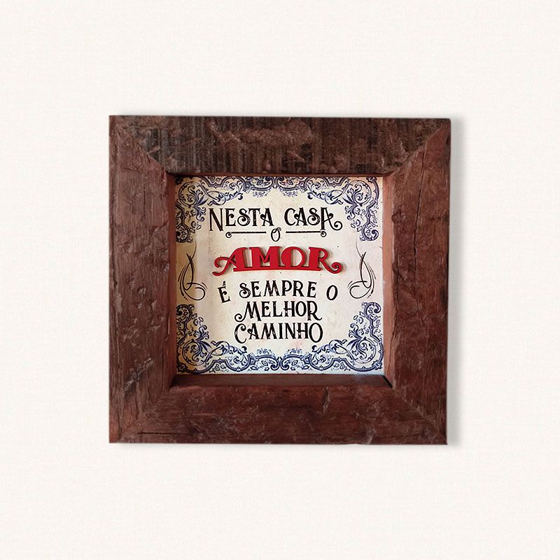 Quadro Com moldura em madeira de dormente de ferrovia com miolo em azulejo e detalhes em relevo.