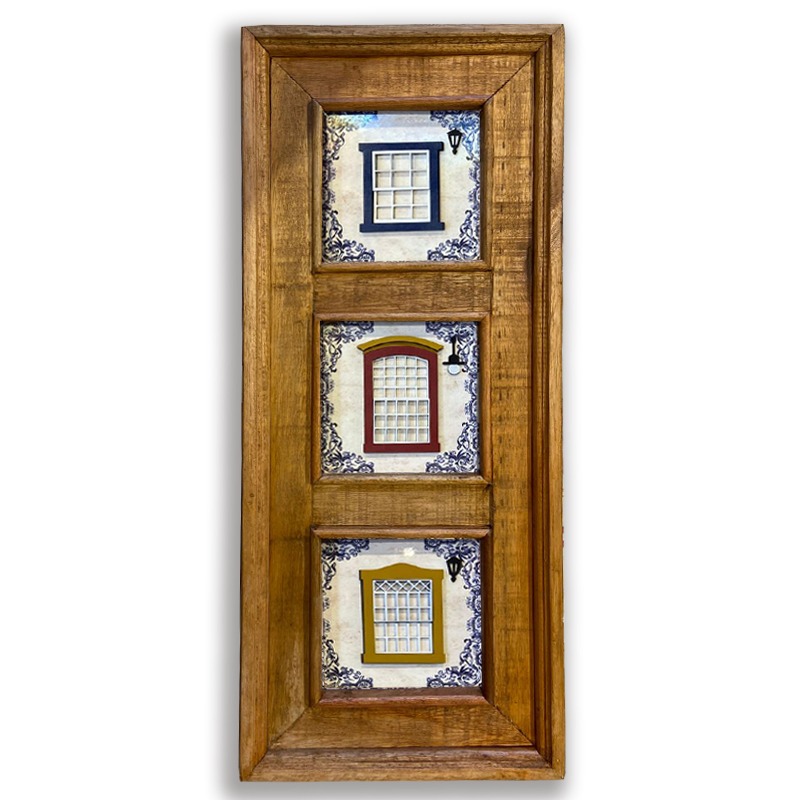 Descubra a poesia das janelas coloniais de Tiradentes em uma peça única de decoração: o quadro “Janelas de Tiradentes”, uma verdadeira obra de arte feita à mão com azulejos artísticos e madeira de demolição, resgatada de construções antigas e repleta de história.