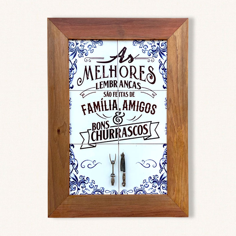Quadro em madeira de demolição com miolo em 6 AZULEJOS no tamanho de 15x15cm, apliques de metais em fundição no tamanho de 62cm x 47 cm